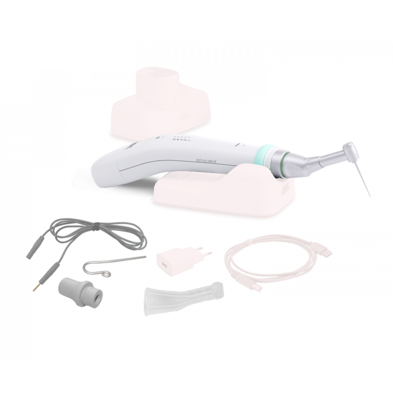 Источник питания наконечника Estus Drive: 1. Li-Ро аккумуляторный блок (2х3,7В; 800мА/ч) с зарядкой от зарядной станции или 2. Li-Ро аккумуляторный блок (3,7В; 800мА/ч) с зарядкой от сети через разъем Type-C