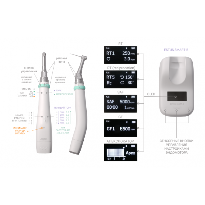 Функции «Safety torque reverse» (STR), «Apical Slow Down», «Apical Reverse», Автоматическая калибровка системы микромотора, 5 рабочих программ