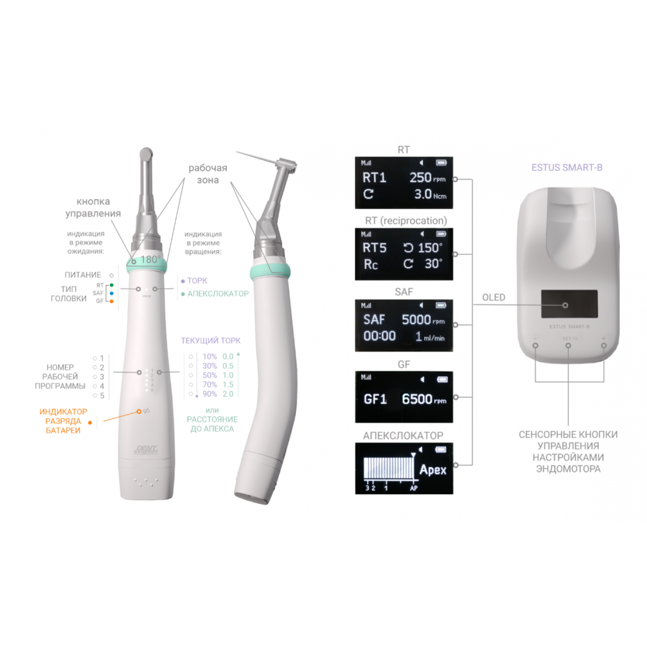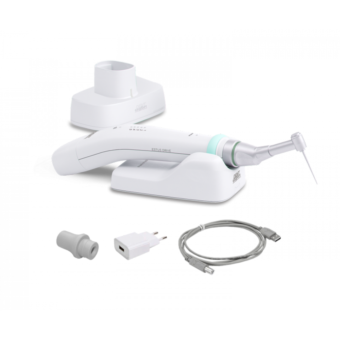 Эндомотор Estus Drive с головкой «RT» для препарирования корневых каналов зуба с использованием любых типов Ni‐Ti файлов непрерывного и реципрокного вращения при скорости от 200 до 1200 об/мин.