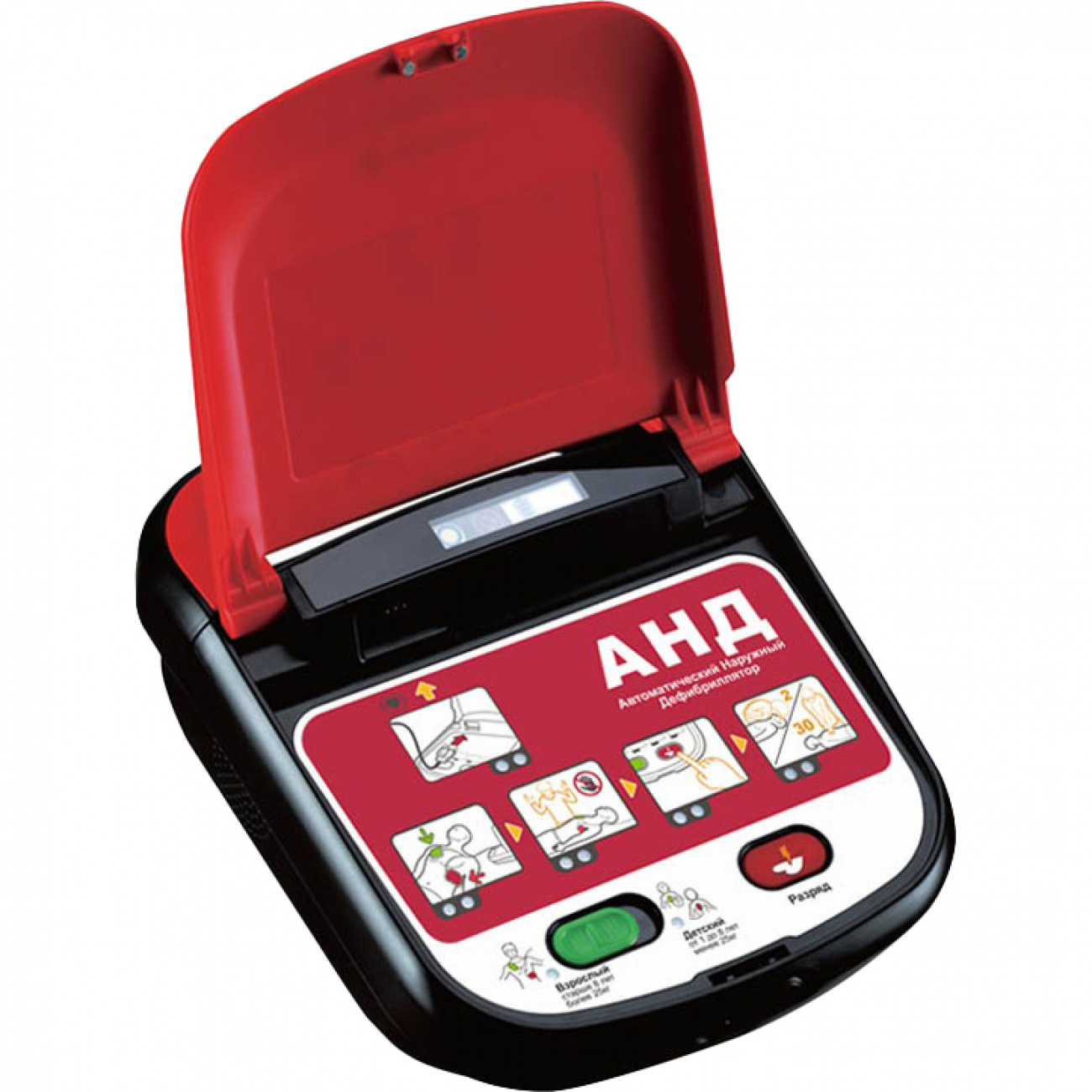 Автоматический наружный дефибриллятор для оказания первой помощи пациентам при внезапной остановке сердца. Прибор автоматически определяет нарушение сердечного ритма и посылает спасателям сигнал, когда нужно выполнить разряд.