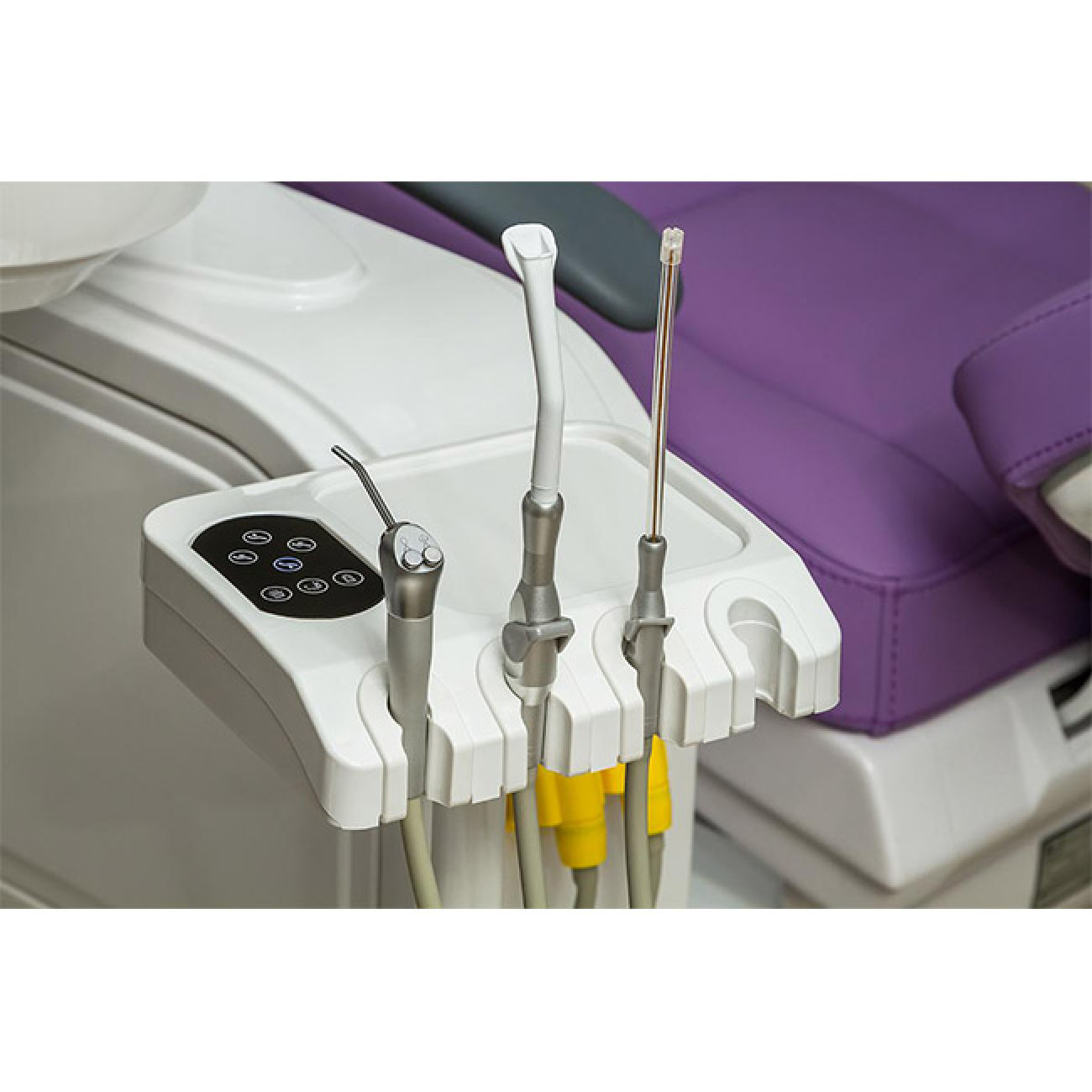 Модуль ассистента на 4 инструмента с пылесосом и слюноотсосом (шланги с увеличенным просветом для использования с вакуумной помпой), пистолетом вода/воздух и 4-м свободным местом, для полимеризационной ламы или интраоральной камеры.