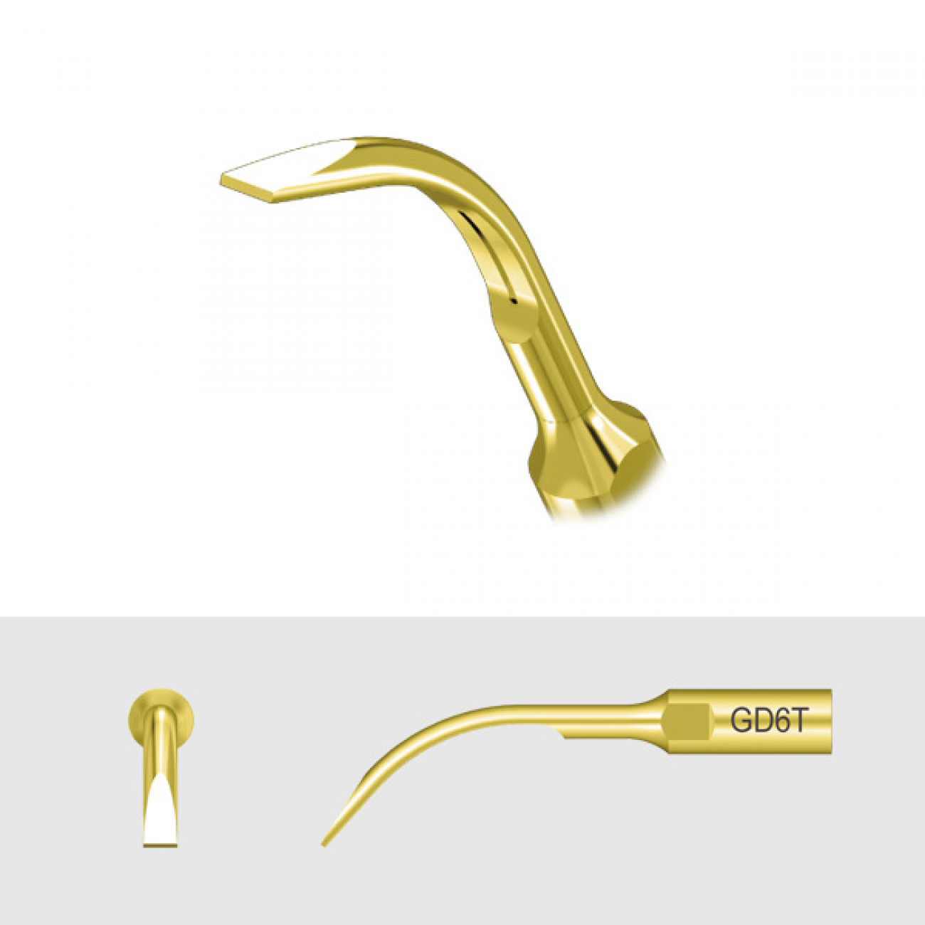 Широкий наконечник для скалеров DTE и NSK типа GD6T предназначен для быстрого удаления объемных отложений зубного камня и адгезивного налета с большей площади наддесневой части зуба. Ширина кончика рабочей части насадки составляет 2,1 мм. Дополнительное нитрид-титановое покрытие защищает поверхность наконечника от коррозии и износа.