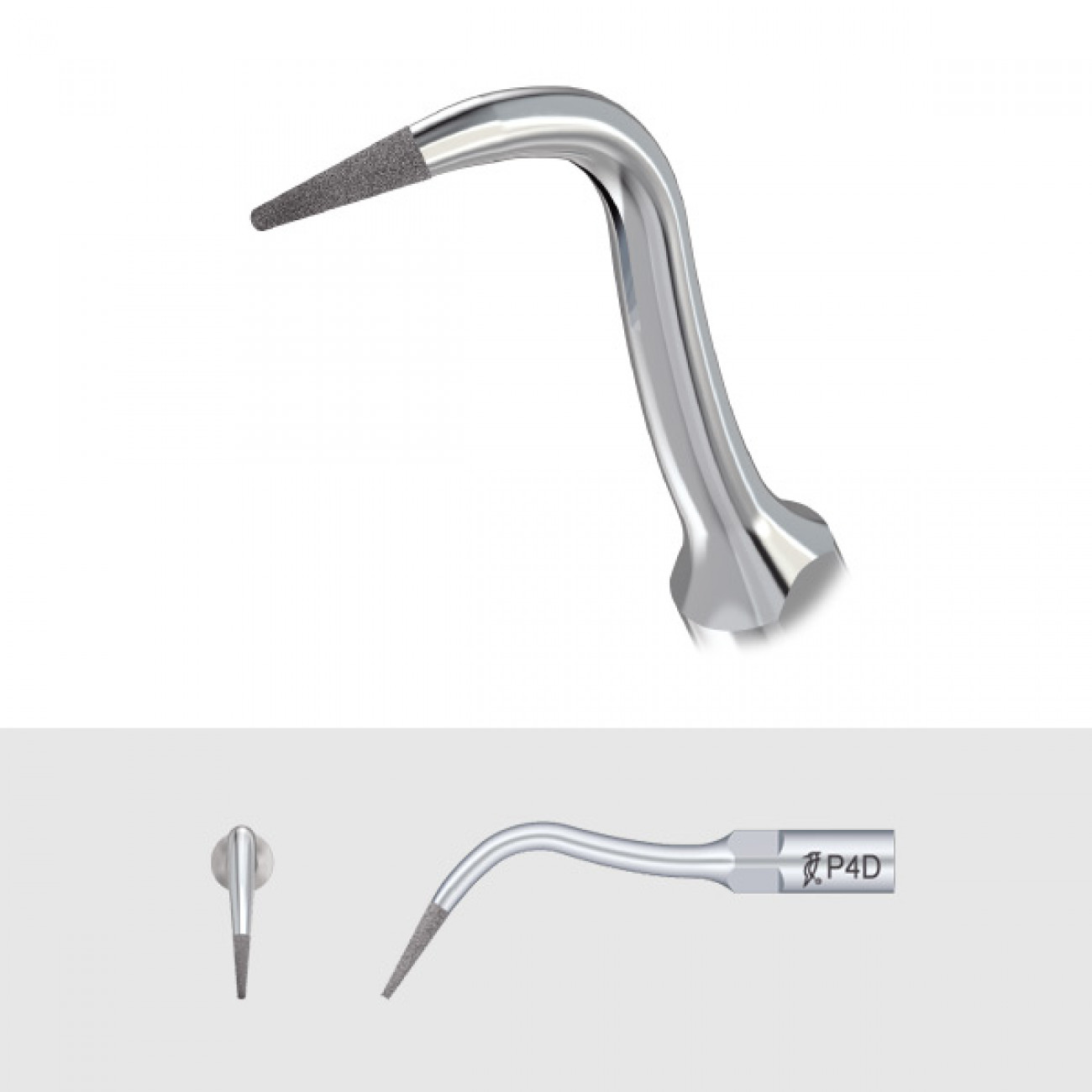 Наконечник для скалеров Woodpecker и EMS типа P4D с алмазным напылением предназначен для ориентации зубного канала и удаления кальцифицированных фрагментов из верхней трети зубного канала. При работе с насадками с алмазным напылением необходимо снизить нажим на инструмент, чтобы избежать повреждения корневого канала.