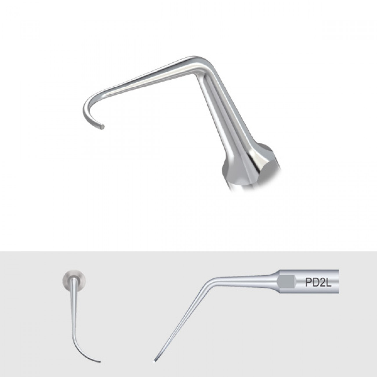 Изогнутый в левую сторону наконечник для скалеров DTE и NSK типа PD2L предназначен для очистки области фуркации многокорневых зубов от зубных отложений.