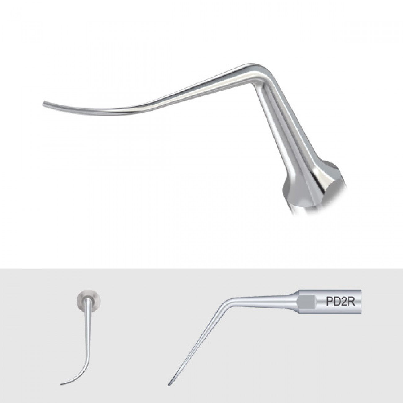 Изогнутый в правую сторону наконечник для скалеров DTE и NSK типа PD2R предназначен для очистки области фуркации многокорневых зубов от зубных отложений.