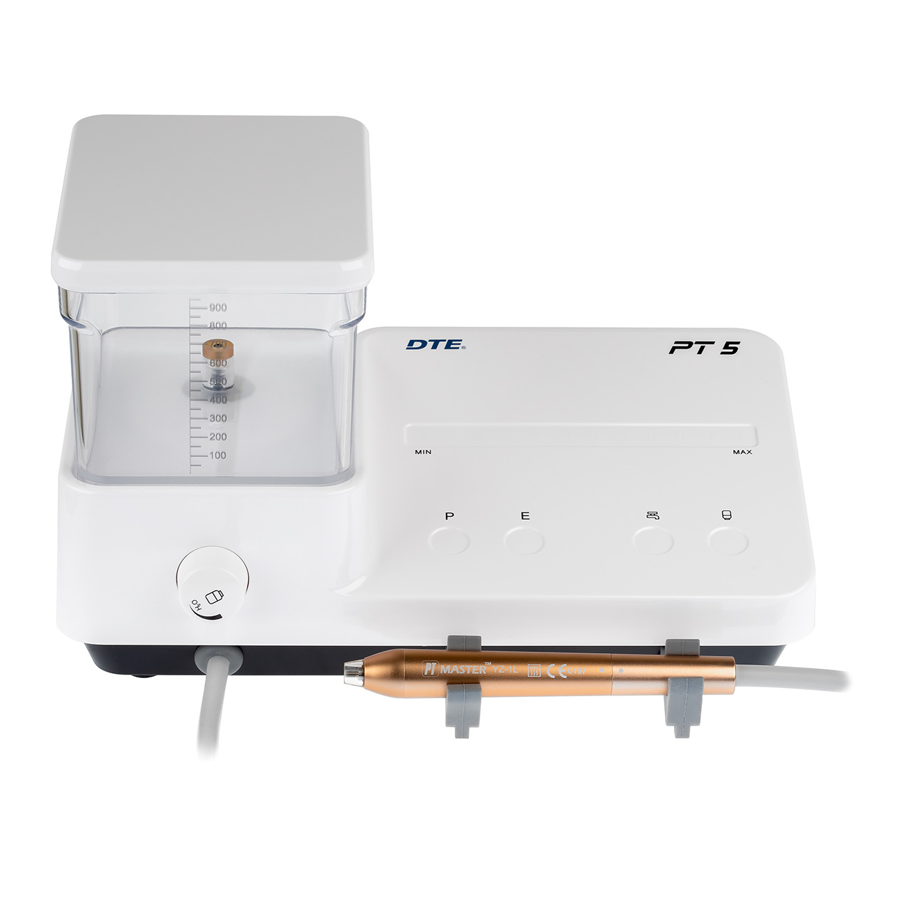 PT Master 5 оснащен автоматической подачей воды. В комплекте с аппаратом поставляются 2 резервуара для охлаждающей жидкости. Добавление жидкости в резервуар производится без его извлечения из основного блока, что существенно упрощает работу. Пьезо-скалер позволяет использовать лекарственные растворы, такие как хлоргексидин, перекись водорода и гипохлорит натрия. Также есть возможность подключения внешнего источника жидкости.