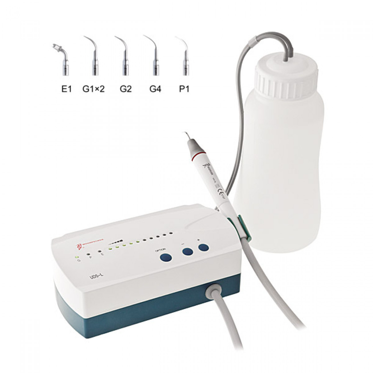 В комплект поставки входят 6 насадок различных типов, включая насадки для удаления камня и адгезивного налета с наддесневой части зуба, в придесневых участках, десневых карманах и с поверхности корня, а также эндочак для очистки и промывания корневых каналов. При необходимости прибор можно использовать для подключения к питанию полимеризационной лампы Woodpecker.