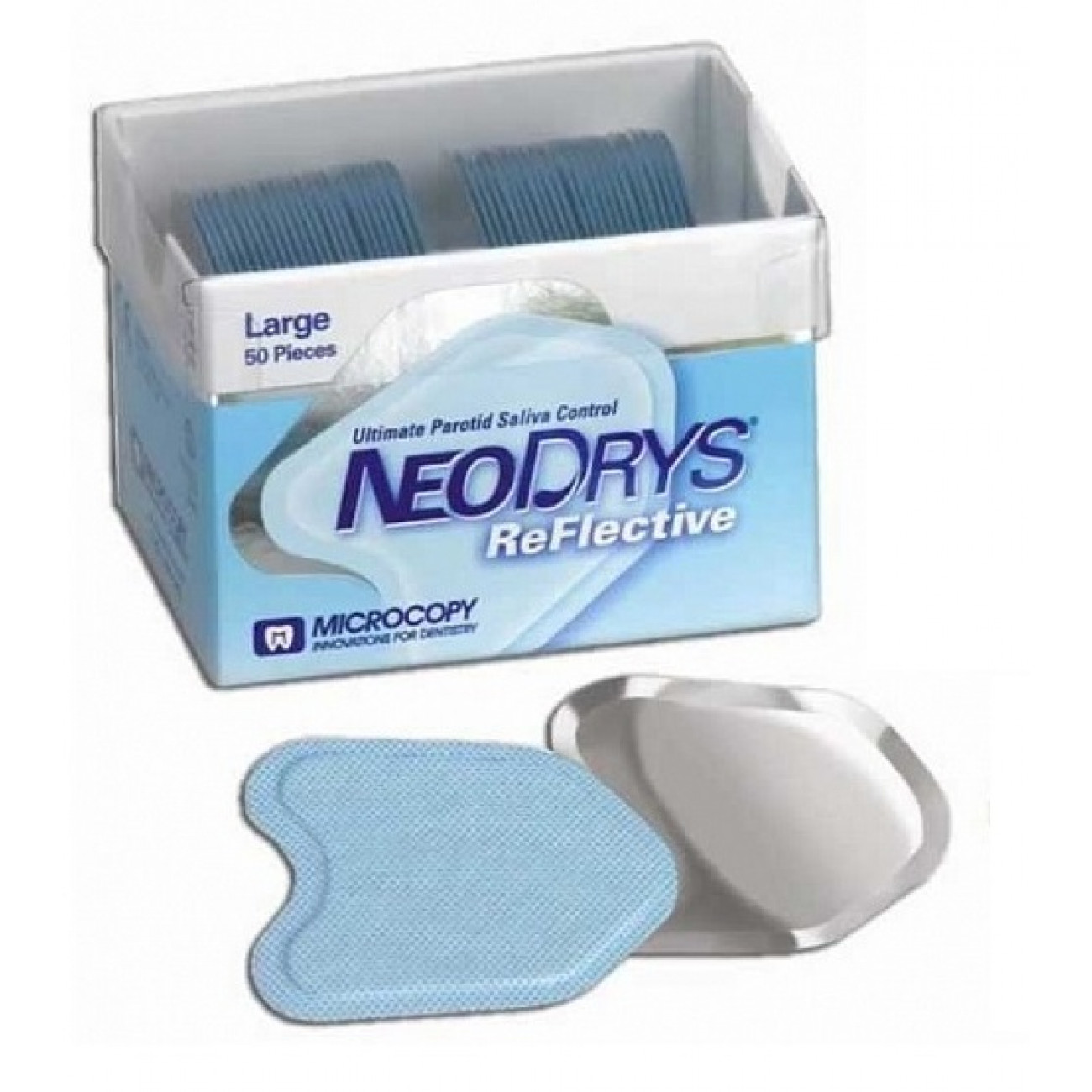 Продукт DryTips состоит из трех скрепленных вместе слоев прокладки, эффективно абсорбирующих слюну, предназначен для наложения на область отверстий околоушных желез и слизистые оболочки щек во время стоматологических процедур, для которых полость рта постоянно должна оставаться сухой.