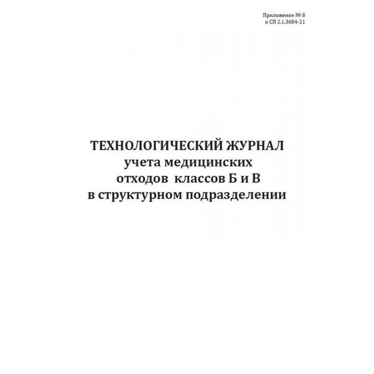 Форма журнала соответствует Приложению N 8 к СанПиН 2.1.3684-21 Санитарно-эпидемиологические требования к содержанию территорий городских и сельских поселений, к водным объектам, питьевой воде и питьевому водоснабжению, атмосферному воздуху, почвам, жилым помещениям, эксплуатации производственных, общественных помещений, организации и проведению санитарно-противоэпидемических (профилактических) мероприятий