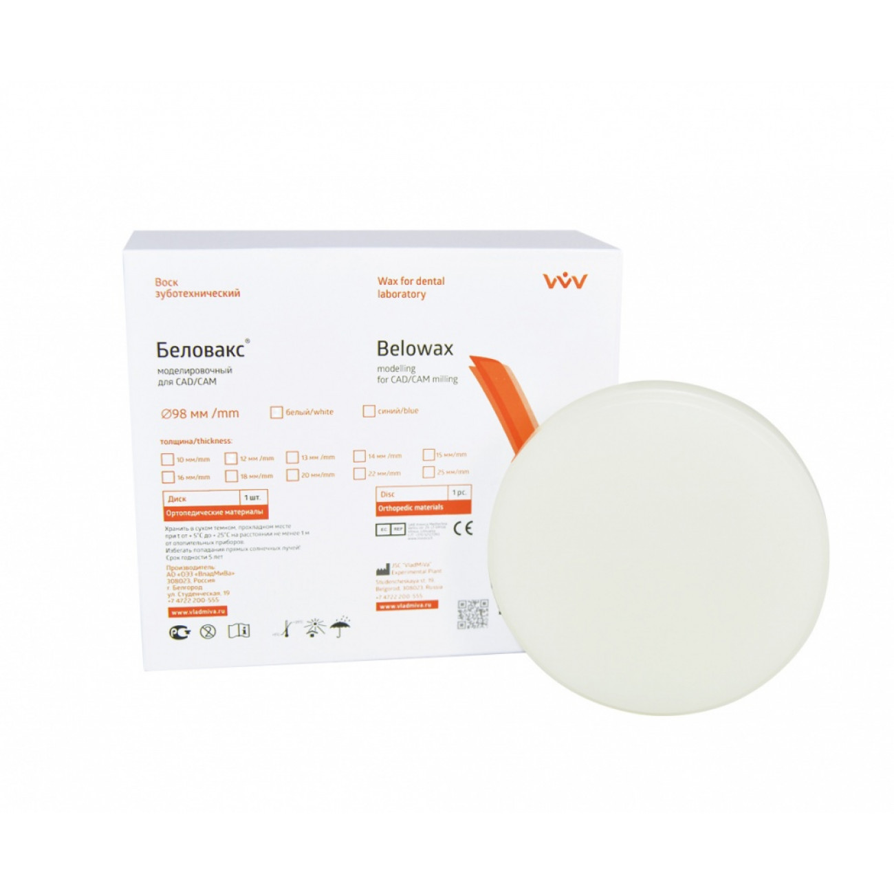 Воск «Беловакс» для CAD/CAM фрезерования выпускается в виде дисков изготовленных из смеси парафина и полиэтилена. Диски могут быть окрашены в синий, серый или белый цвет. Воск различного цвета не отличается по своим физико-химическим свойствам.