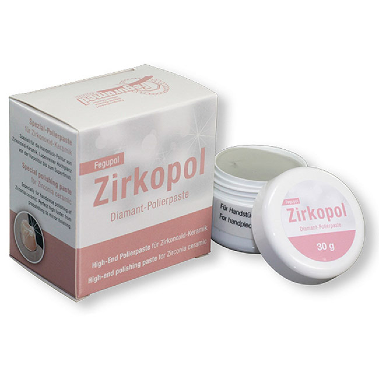 Fegupol Zirkopol алмазная полировочная паста, предназначена для керамики на основе оксида циркония. Максимально плотная, имеющая зеркальный блеск поверхность керамики на основе оксида циркония имеет ключевое значение, только так можно предотвратить образование пятен и гарантировать длительный срок службы зубного протеза.
