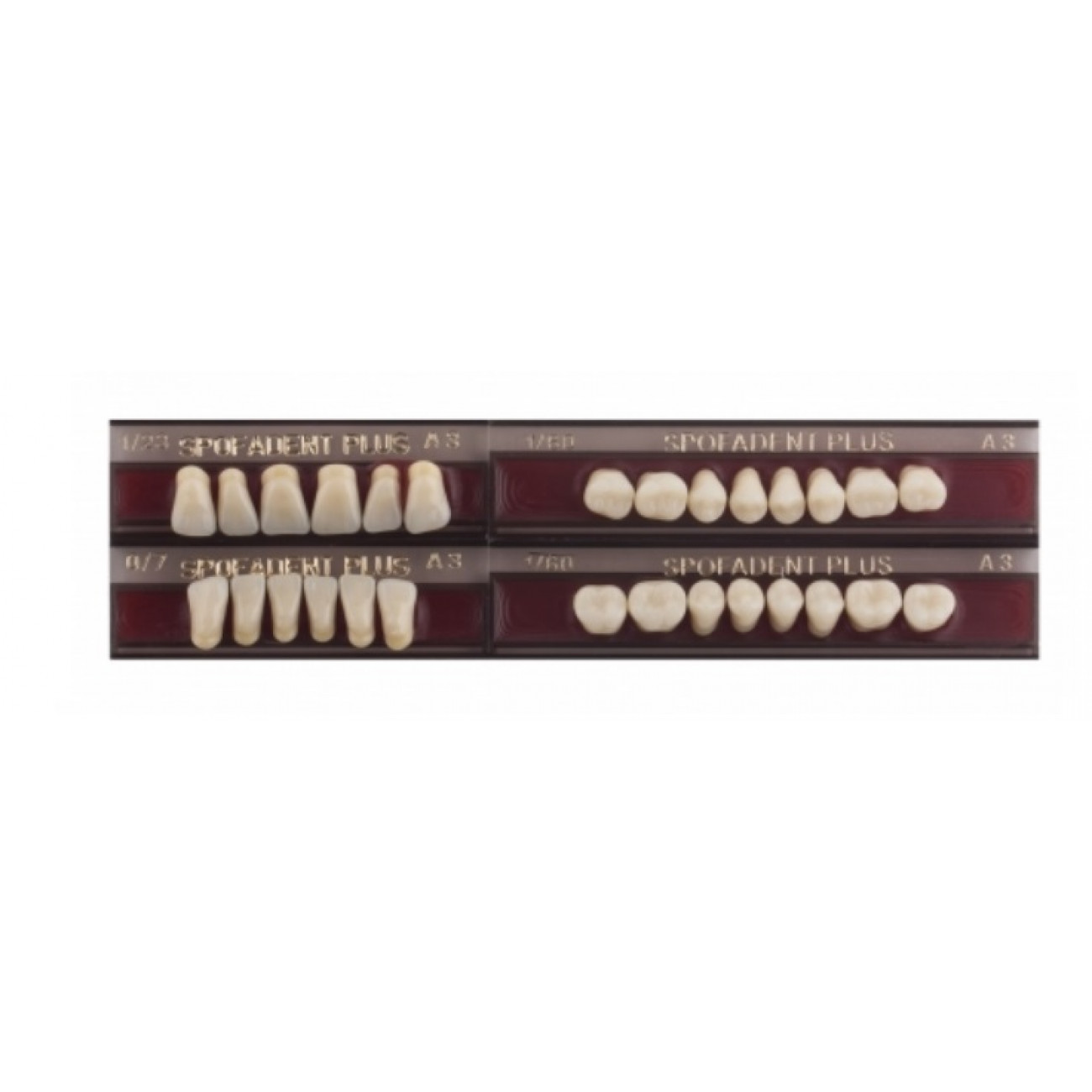 Акриловые зубы - цвет А3, для изготовления зубных протезов съёмного типа. Производятся из сополимеров метилметакрилата. К достоинствам пластмассовых зубов Спофадент Плюс можно отнести высокую цветостабильность, химическую стойкость, устойчивость к истиранию.