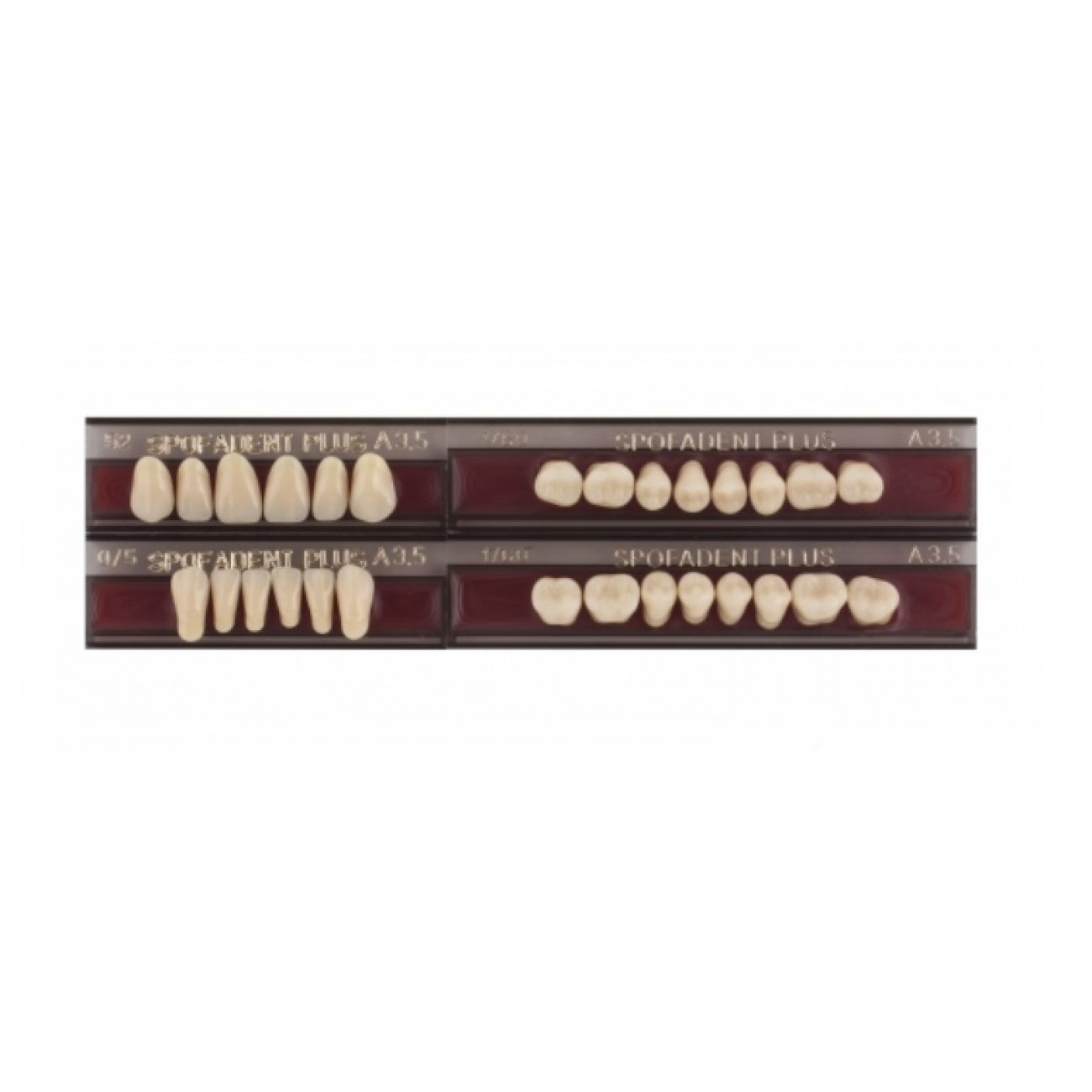 Акриловые зубы - цвет А3,5 для изготовления зубных протезов съёмного типа. Производятся из сополимеров метилметакрилата. К достоинствам пластмассовых зубов Спофадент Плюс можно отнести высокую цветостабильность, химическую стойкость, устойчивость к истиранию.