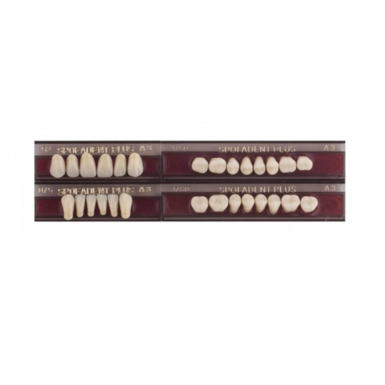 Акриловые зубы - цвет А3, для изготовления зубных протезов съёмного типа. Производятся из сополимеров метилметакрилата. К достоинствам пластмассовых зубов Спофадент Плюс можно отнести высокую цветостабильность, химическую стойкость, устойчивость к истиранию.