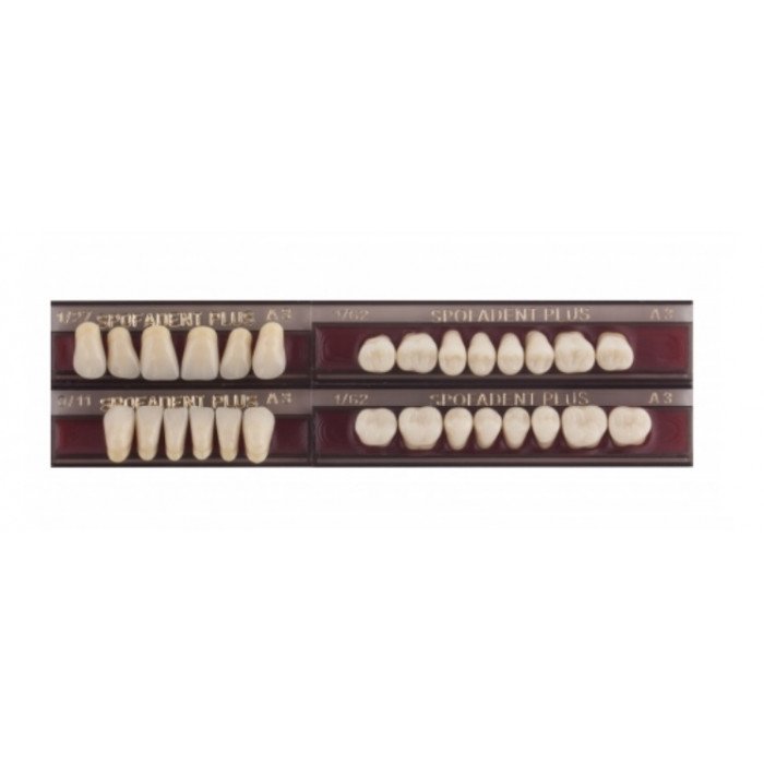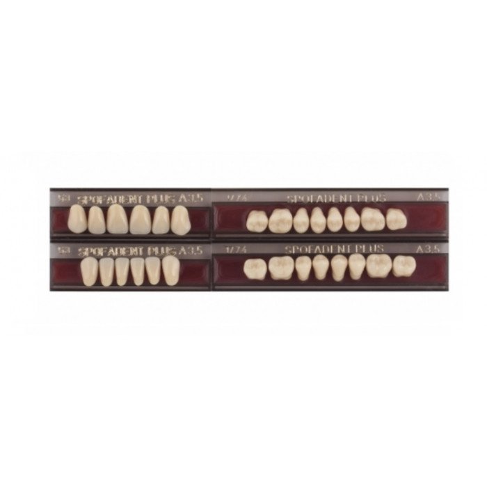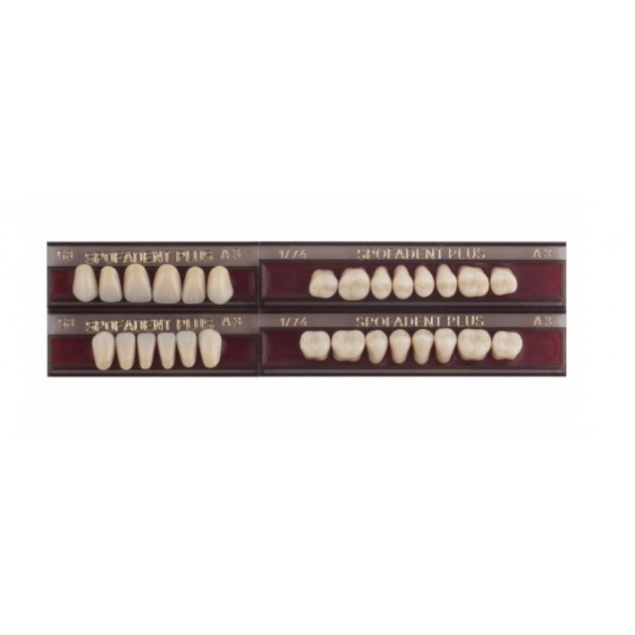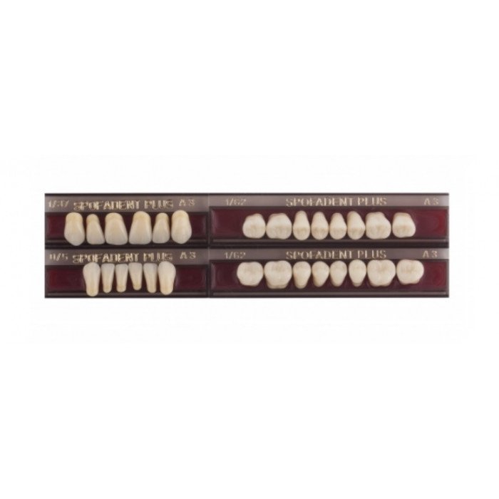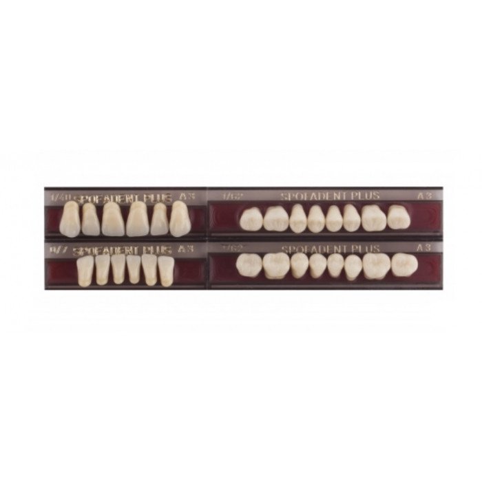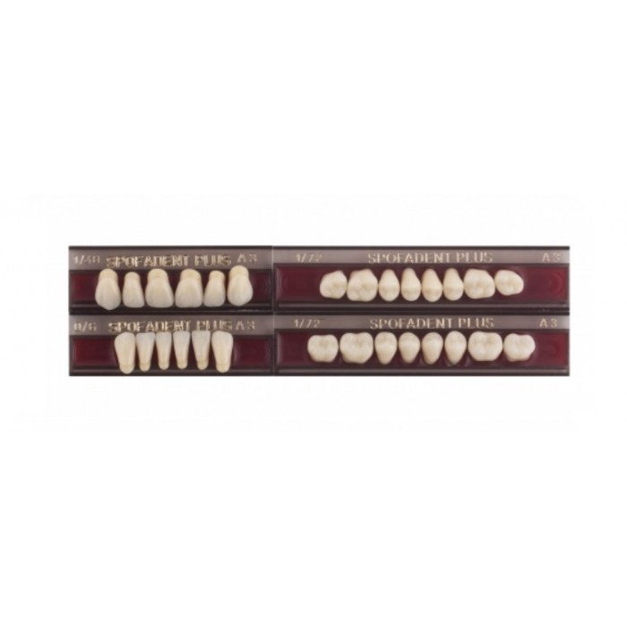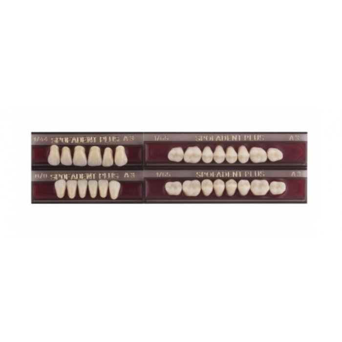 Пластмассовые зубы для изготовления съемных зубных протезов. Зубы, изготовленные из метилметакрилатных кополимеров, имеющие высокую устойчивость к истиранию, высокую химическую устойчивость, долговечную цветовую стабильность и велико-лепные эстетические качества.