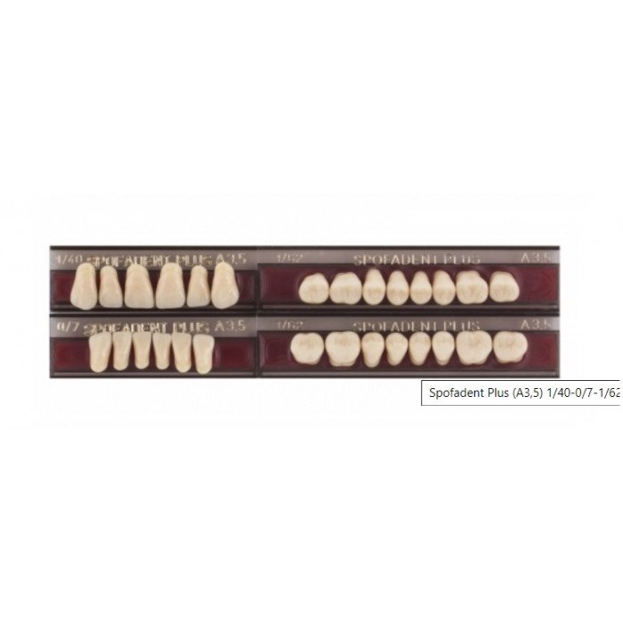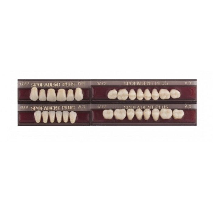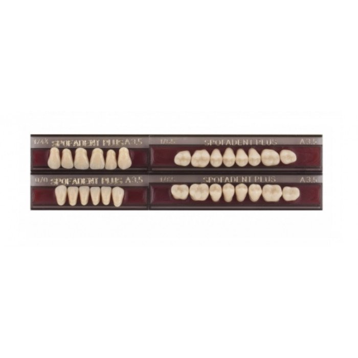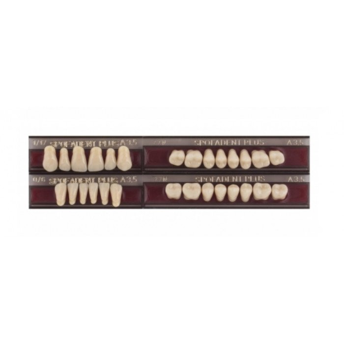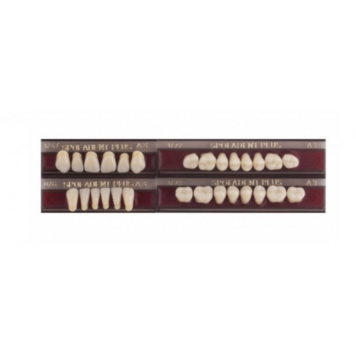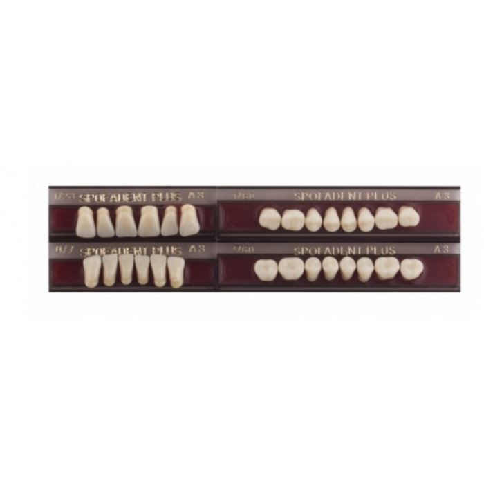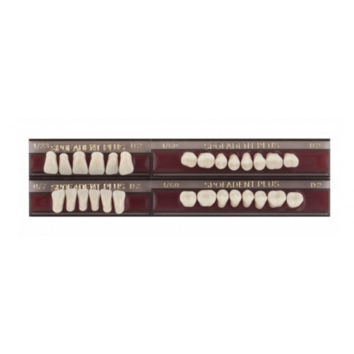 Пластмассовые зубы для изготовления съемных зубных протезов. Зубы, изготовленные из метилметакрилатных кополимеров, имеющие высокую устойчивость к истиранию, высокую химическую устойчивость, долговечную цветовую стабильность и велико-лепные эстетические качества.