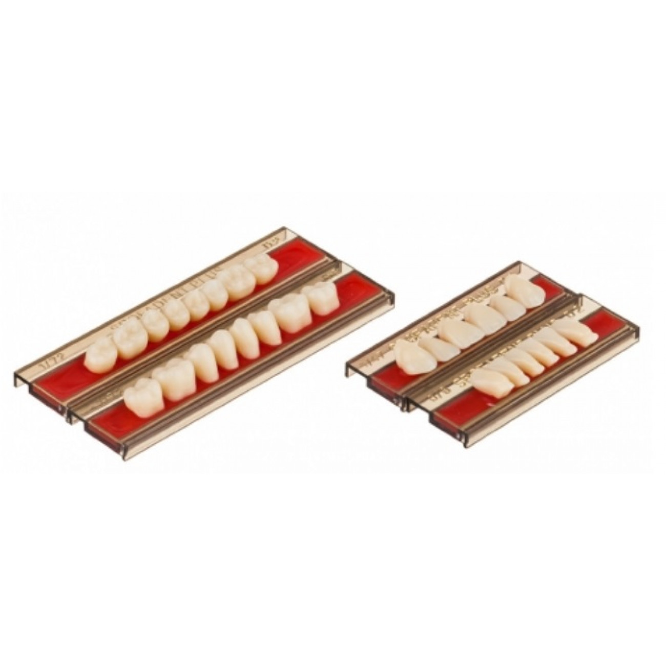 Пластмассовые зубы для изготовления съемных зубных протезов. Зубы, изготовленные из метилметакрилатных кополимеров, имеющие высокую устойчивость к истиранию, высокую химическую устойчивость, долговечную цветовую стабильность и велико-лепные эстетические качества.